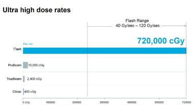 在2018年10月北美放射腫瘤學(xué)會(huì)年會(huì)上,瓦里安宣布了具有“諾貝爾獎(jiǎng)”意義的超高劑量極速癌癥治療方法——“Flash”。這將是革命性的最新粒子治療方法。Flash 療法是一種非侵入性治療,以極高的劑量及劑量率(72萬(wàn)cGy/分鐘)在極短的時(shí)間里(1秒內(nèi))對(duì)人體癌癥部位釋放質(zhì)子束流。在一次照射后,癌癥細(xì)胞能就被摧毀而正常細(xì)胞損害顯著降低。目前已經(jīng)基本完成動(dòng)物試驗(yàn),不久將進(jìn)入臨床試驗(yàn)階段。