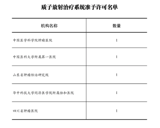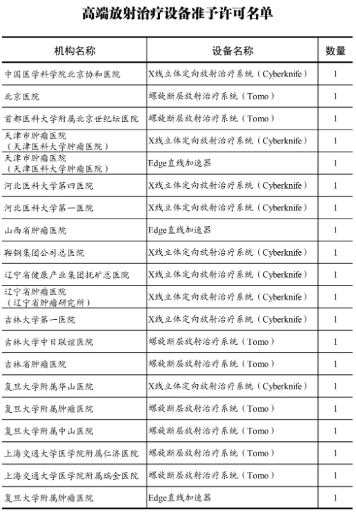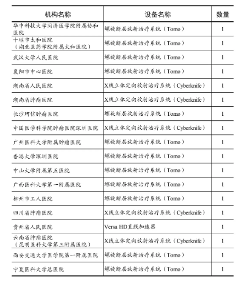 近日,國家衛(wèi)生健康委員會(衛(wèi)健委)發(fā)布了《關于2019年甲類大型醫(yī)用設備配置許可的通告》(以下統(tǒng)稱“通告”),通告中公布了已取得質子放射治療系統(tǒng)、正電子發(fā)射型磁共振成像系統(tǒng)(PET/MR)、高端放射治療設備(包括X線立體定向放射治療系統(tǒng)(英文簡稱Cyberknife)、螺旋斷層放射治療系統(tǒng)(英文簡稱Tomo)HD和HDA兩個型號、Edge和Versa)配置許可證的醫(yī)院名單。