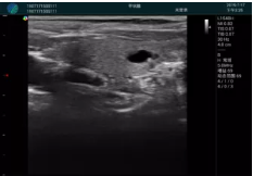 腺體內(nèi)部清晰顯示一低回聲塊影,形態(tài)不規(guī)則,邊界模糊,邊緣呈毛刺狀,內(nèi)部見(jiàn)砂礫樣鈣化