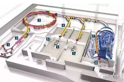 3. 同步加速器:六個(gè)60°磁鐵將離子束彎曲成圓形路徑。在大約一百萬(wàn)個(gè)軌道中,離子被加速到高達(dá)75%的光速。