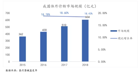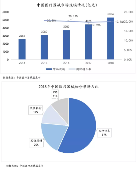 隨著國(guó)內(nèi)經(jīng)濟(jì)水平的發(fā)展,民眾支付能力的提升,人口老齡化的增加,健康需求不斷增加,中國(guó)醫(yī)療器械市場(chǎng)保持高速增長(zhǎng)。2018年中國(guó)醫(yī)療器械市場(chǎng)規(guī)模約為5304億元,同比增長(zhǎng)19.86%,預(yù)計(jì)未來(lái)5年將繼續(xù)保持15%以上年復(fù)合增速,遠(yuǎn)高于國(guó)內(nèi)GDP增速。醫(yī)療設(shè)備市場(chǎng)是中國(guó)醫(yī)療器械最大的細(xì)分市場(chǎng),占比 56.80%;其次為高值醫(yī)用耗材市場(chǎng),占比 19.72%,IVD占比約11%。