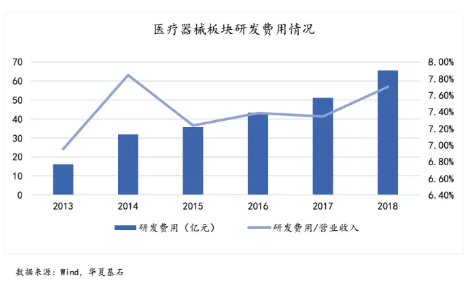 近年我國(guó)醫(yī)療器械上市公司的研發(fā)投入和人員占比持續(xù)增長(zhǎng),反映了醫(yī)療器械行業(yè)發(fā)展進(jìn)程對(duì)國(guó)內(nèi)企業(yè)的研發(fā)提出了越來(lái)越高的要求,行業(yè)逐步由銷(xiāo)售驅(qū)動(dòng),轉(zhuǎn)向研發(fā)和銷(xiāo)售雙輪驅(qū)動(dòng)。但總量依然不足,2018年我國(guó)所有醫(yī)療器械上市公司公司的研發(fā)投入總和為65.5億元人民幣,不及1家跨國(guó)公司投入。(美敦力在2018年研發(fā)總投入為22.53億美元)