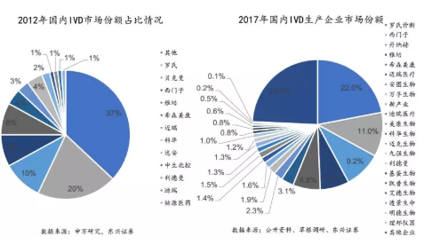 (1)、IVD企業(yè)分規(guī)模較小,高端產(chǎn)品和市場(chǎng)多數(shù)被跨國(guó)企業(yè)壟斷。國(guó)內(nèi)IVD企業(yè)沒(méi)有一家營(yíng)收規(guī)模超50億元人民幣。同時(shí)高附加值的診斷產(chǎn)品上,進(jìn)口產(chǎn)品的國(guó)內(nèi)市場(chǎng)占有率達(dá)80以上;在三級(jí)甲等醫(yī)院等高端醫(yī)療市場(chǎng)中,進(jìn)口產(chǎn)品占有率也超80%。