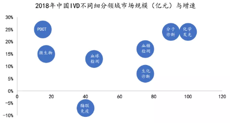隨著IVD產(chǎn)業(yè)技術(shù)升級(jí),中國(guó)市場(chǎng)IVD不同細(xì)分領(lǐng)域發(fā)展有較大差異,生化和免疫診斷中的酶聯(lián)免疫等低端產(chǎn)品增速低,而化學(xué)發(fā)光, POCT和分子診斷等高技術(shù)產(chǎn)品維持高增速。