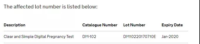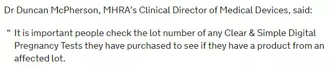 譯:MHRA醫(yī)療器械的臨床主任鄧肯·麥克弗森博士說(shuō):人們要重點(diǎn)檢查他們購(gòu)買(mǎi)的任何清晰和簡(jiǎn)單的數(shù)字妊娠測(cè)試的批號(hào),看看他們是否有來(lái)自受影響批號(hào)的產(chǎn)品。