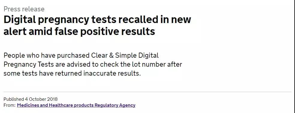 據(jù)BBC、《衛(wèi)報(bào)》、美國(guó)CNN等多家媒體報(bào)道,英國(guó)驗(yàn)孕棒品牌Clear&Simple的一批已售出的電子驗(yàn)孕棒中,至少有58000名英國(guó)顧客的驗(yàn)孕結(jié)果可能出現(xiàn)“假陽(yáng)性”,而這其中的大部分的女性很有可能根本沒(méi)有懷孕。這一數(shù)字在隨后的英國(guó)《電訊報(bào)》的報(bào)道中增加至60000人。