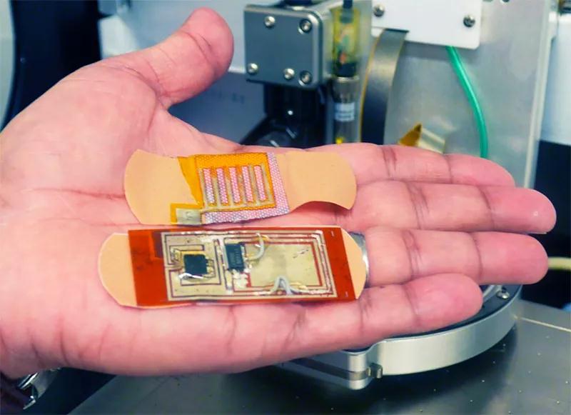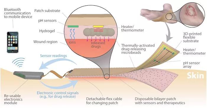 這種類(lèi)型也是智能繃帶,它能通過(guò)電子元件記錄潰瘍形成、感染、氧氣、壓力、溫度、濕度、血糖水平來(lái)評(píng)估傷口的愈合進(jìn)度,幫助醫(yī)生及時(shí)做出決定。