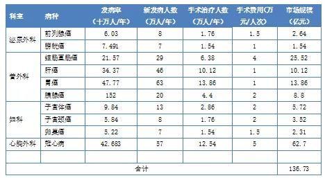 我們根據(jù)手術(shù)機(jī)器人的適應(yīng)癥對(duì)每年市場(chǎng)規(guī)模進(jìn)行了測(cè)算,認(rèn)為手術(shù)機(jī)器人國(guó)內(nèi)潛在市場(chǎng)空間為136.73億元/年。其中,泌尿外科和婦科市場(chǎng)規(guī)模為15.73億元,普外科為58.3億元,心臟外科為62.7億元。
