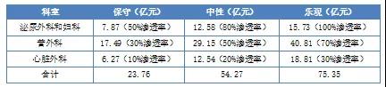 根據(jù)以上測(cè)算數(shù)據(jù)以及合理預(yù)計(jì),對(duì)國(guó)內(nèi)每年的手術(shù)機(jī)器人市場(chǎng)規(guī)模進(jìn)行估算。因此,從保守、中性和樂(lè)觀三種測(cè)算來(lái)看,現(xiàn)階段我國(guó)每年手術(shù)機(jī)器人服務(wù)市場(chǎng)的規(guī)模為23.76億元、54.27億元和75.35億元。但隨著手術(shù)機(jī)器人成本降低以及技術(shù)水平提高,其在普外和心臟外科的滲透率也會(huì)提高,市場(chǎng)規(guī)模將進(jìn)一步擴(kuò)大。