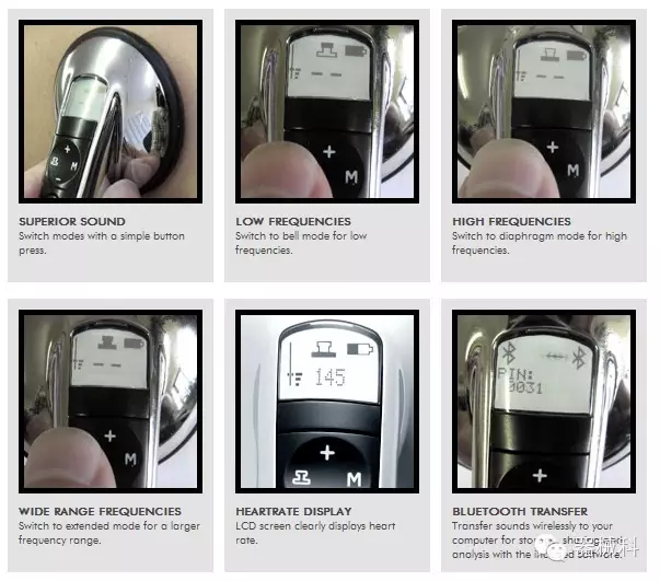 2009年,電子聽診器的發(fā)展達到了新的巔峰,Littmann®3200型電子聽診器(上圖)出現(xiàn)在世人面前。這是首個運用藍牙技術的電子聽診器,它能夠將心臟、肺部和其他身體器官的信號無線傳送到醫(yī)師使用的電腦,并通過Cardioscan軟件實時地將聲音曲線顯示在電腦屏幕上,更準確地揭示患者心臟可能存在的異?,F(xiàn)象。隨后,軟件會對聲波曲線進行分析,并將代表有害雜音的異常部分的細節(jié)突出顯示出來。醫(yī)師能夠將回放速度降低一半來更仔細地分析問題,還能將文件保存到患者的檢查結果中,并通過電子郵件和Scope to Scope遠程聽診軟件,將其發(fā)送給心臟病專家來確認診斷結果。這套系統(tǒng)不僅能夠準確捕捉到危險的雜音,還能減少更為昂貴心電圖檢查費用和不必要的心臟病專家的診療工作。從此傳統(tǒng)的電子聽診器變成了先進的醫(yī)療工具,取代了醫(yī)師對心臟雜音的猜測,提高了診斷能力。隨后3M公司推出了一系列改良產品......目前這方面3M公司的最新產品是Littmann4100系列(下圖)