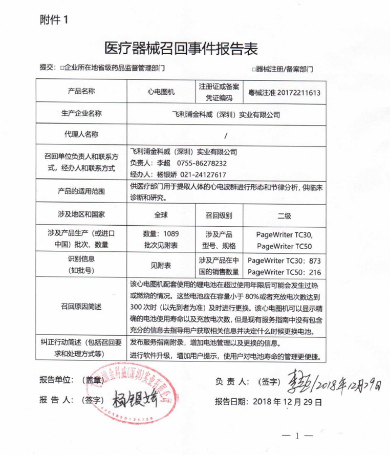2018年,飛利浦也曾發(fā)布了多起對病人監(jiān)護儀的召回,其中一份召回報告也是二級召回,涉及到2672臺監(jiān)護儀,同樣是通過監(jiān)控內(nèi)部產(chǎn)品投訴發(fā)現(xiàn),存在鋰離子電池超過預期使用壽命后發(fā)熱或燃燒風險。