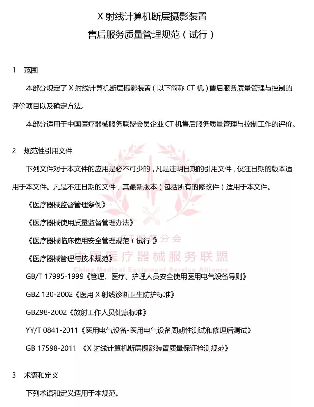 醫(yī)療器械售后服務(wù)質(zhì)量管理是醫(yī)療器械使用質(zhì)量管理的重要一環(huán),為加強(qiáng)e中國醫(yī)療器械服務(wù)聯(lián)盟會(huì)員企業(yè)X射線計(jì)算機(jī)斷層攝影裝置(CT)售后服務(wù)質(zhì)量管理,貫徹執(zhí)行《醫(yī)療器械監(jiān)督管理條例》、《醫(yī)療器械使用質(zhì)量監(jiān)督管理辦法》等規(guī)定、標(biāo)準(zhǔn)和規(guī)范,進(jìn)一步提升和統(tǒng)一獨(dú)立服務(wù)提供商的售后服務(wù)水平、保證設(shè)備使用質(zhì)量和安全,提高客戶服務(wù)滿意度,制定本規(guī)范,作為指導(dǎo)聯(lián)盟會(huì)員企業(yè)在X射線計(jì)算機(jī)斷層攝影裝置售后服務(wù)質(zhì)量管理和控制工作的評(píng)價(jià)標(biāo)準(zhǔn)。