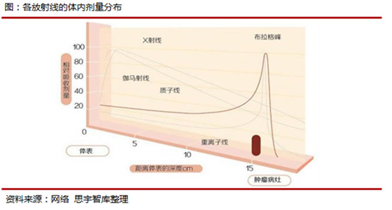 相較傳統(tǒng)的放射方式(γ射線、X射線),質(zhì)子的劑量學(xué)優(yōu)勢更加明顯,其具備明顯而獨(dú)特的深度劑量特征。其獨(dú)特的布拉格峰可使得質(zhì)子束在射入病灶前不釋放出強(qiáng)大的能量,達(dá)到病灶末端時(shí)能量幾乎剛好釋放完畢,充分保護(hù)了腫瘤病灶前后的正常組織。這種特性使得質(zhì)子重離子相對其它射線天然地更為適合用于放療。